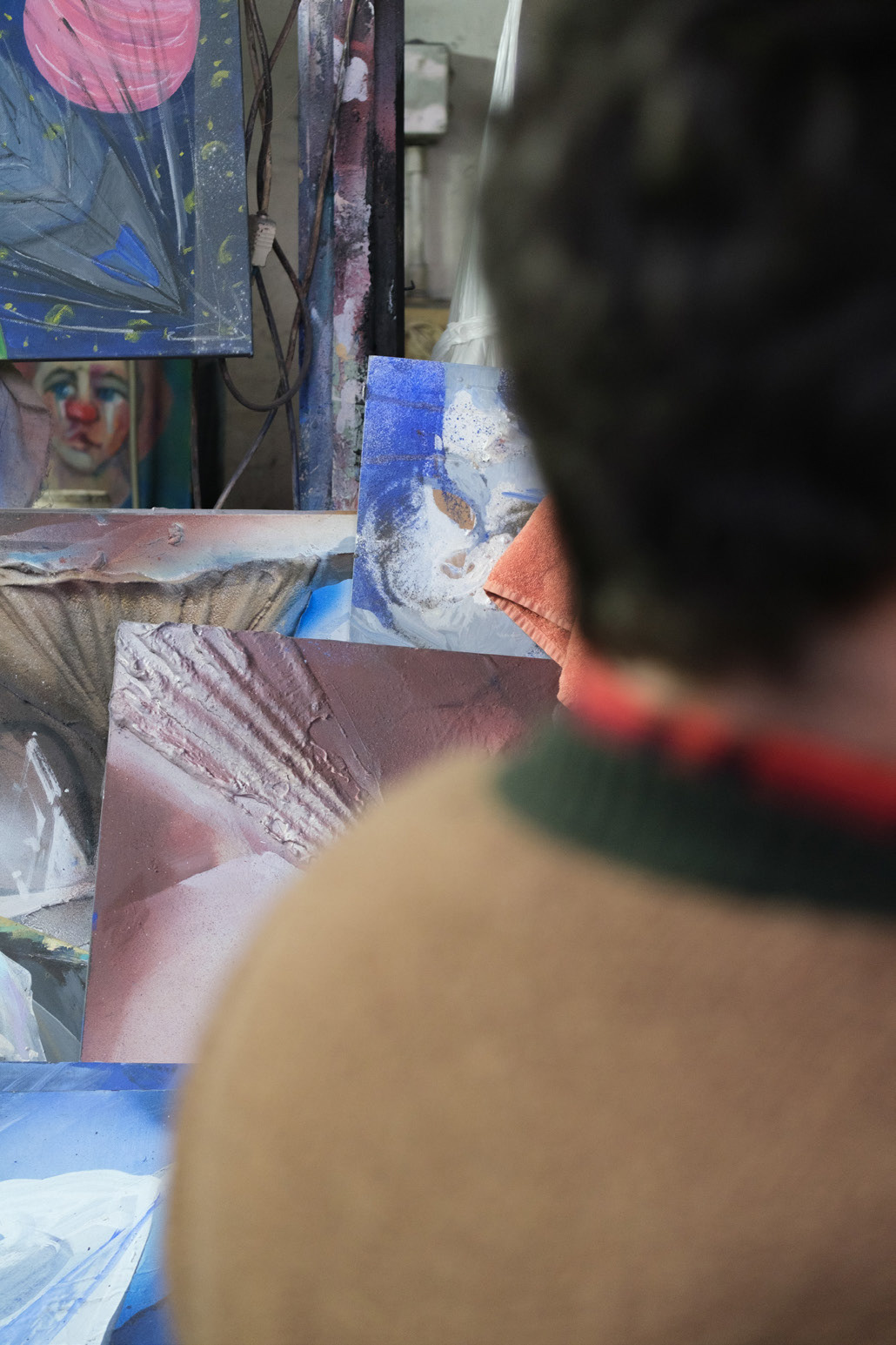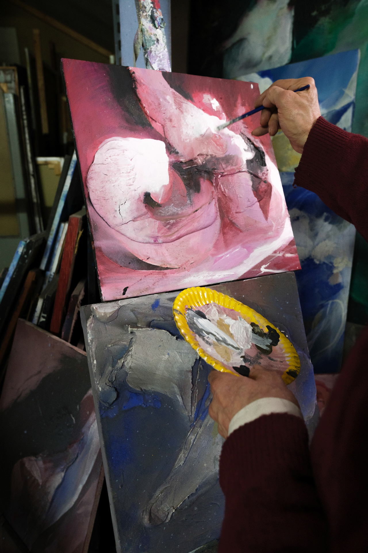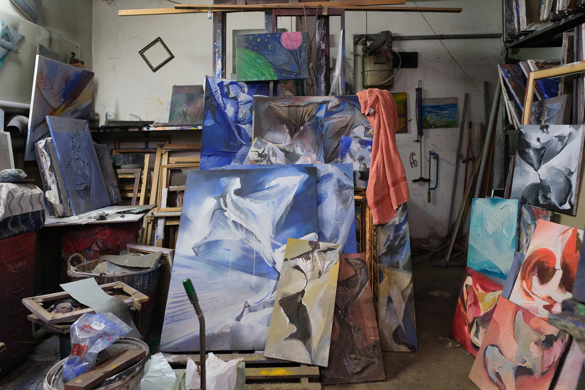 la vorticità delle tele si unisce alla caoticità dello studio, rendendo opera ogni singolo oggetto nella tana del pittore